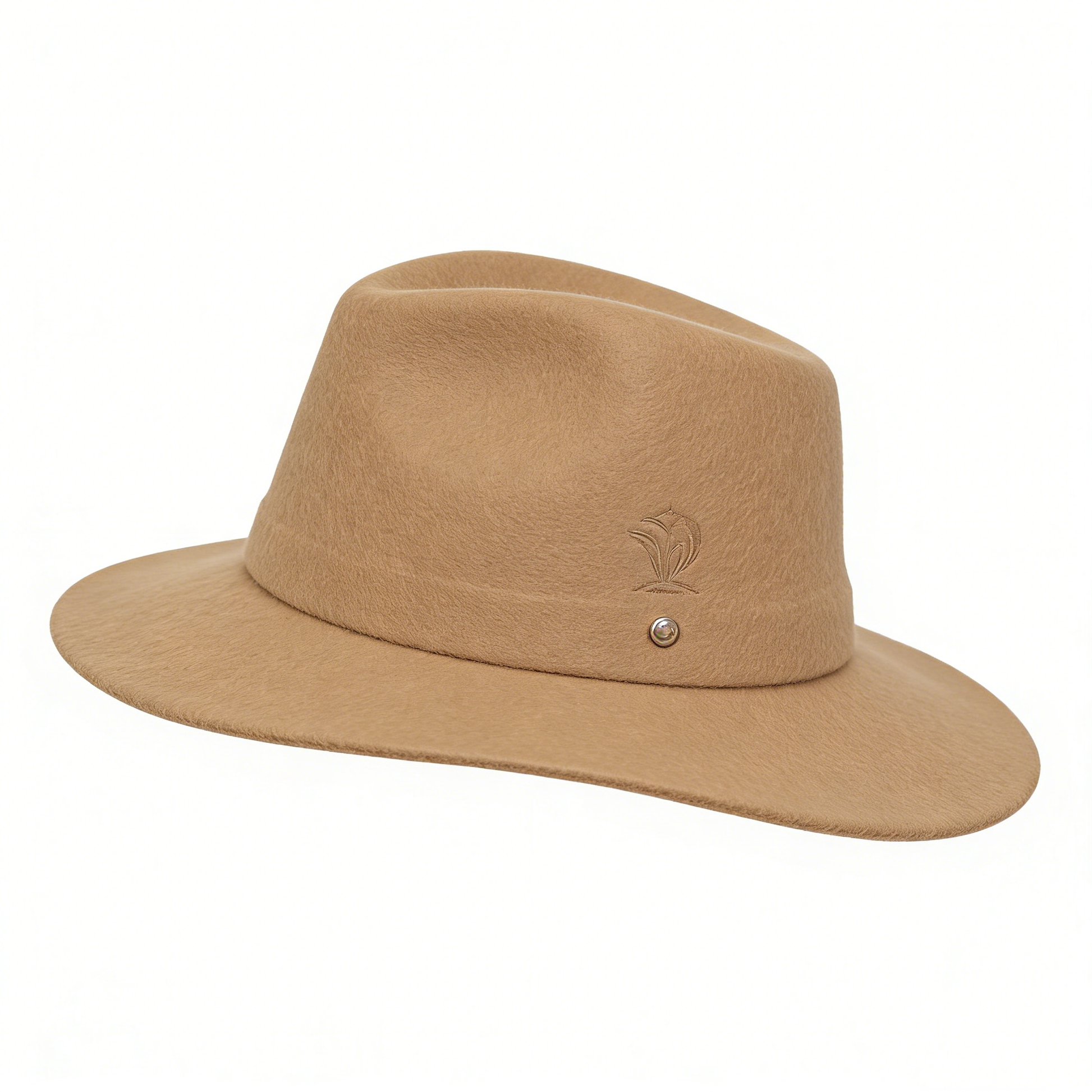 Crafted from premium wool felt, this camel fedora features a wide, structured brim and a subtle embossed logo for understated elegance. Its classic silhouette pairs seamlessly with both casual and dressy outfits, making it a timeless accessory for cool-weather days.