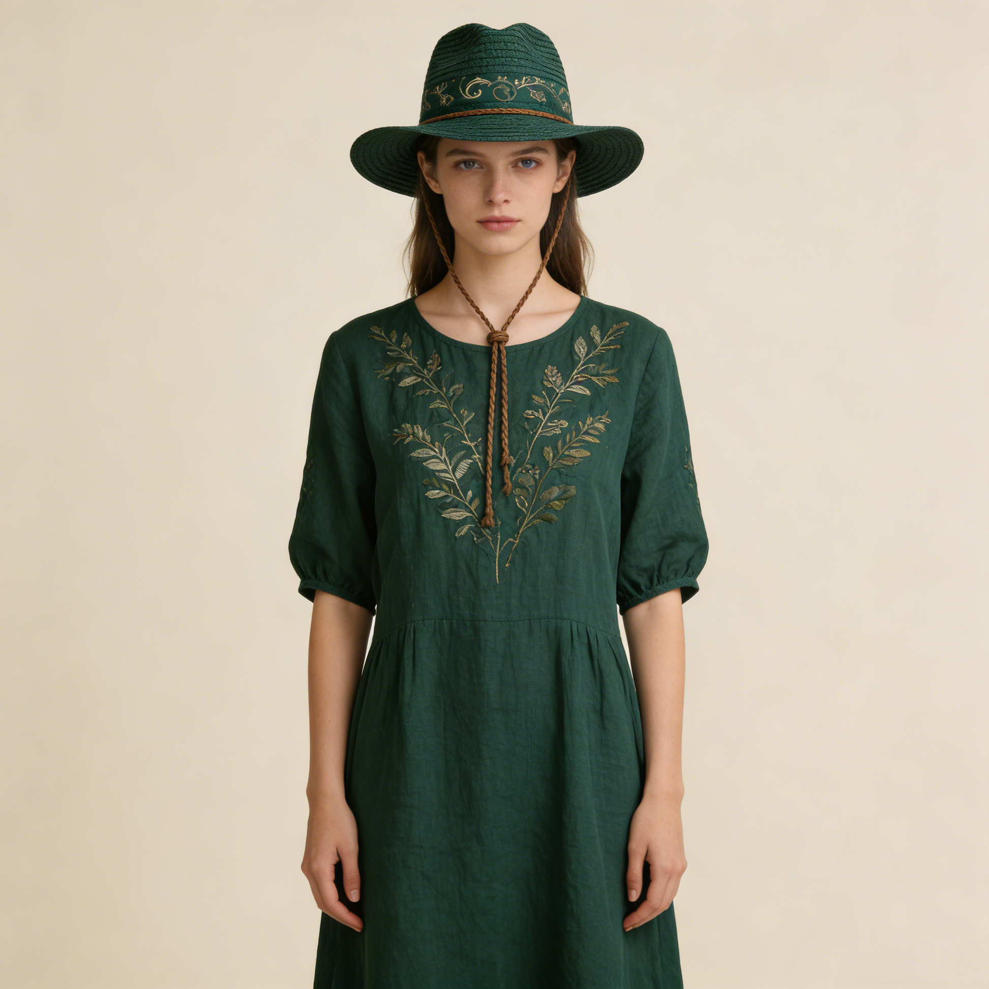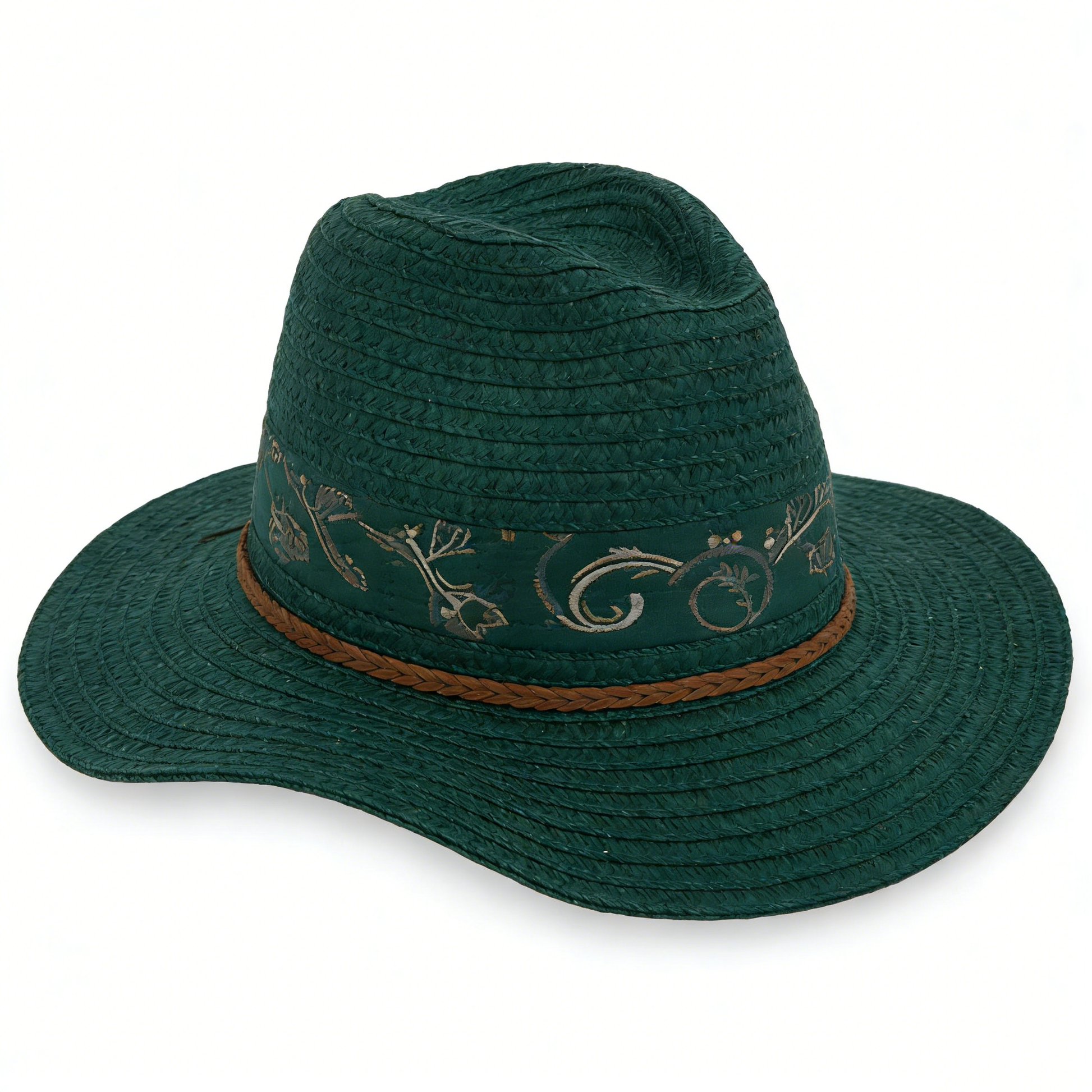 The Emerald Grove Safari Hat is a stylish companion for warm-weather adventures, crafted from lightweight, breathable woven straw in a rich forest green hue. Its wide, floppy brim offers ample sun protection, while the layered hat band—featuring a metallic vine-print silk strip and a braided leather accent—adds a touch of bohemian elegance. The structured crown keeps its shape all day, making it perfect for garden parties, coastal walks, or music festivals. This hat blends earthy charm with artisanal details, ensuring you stay cool and chic under the sun.