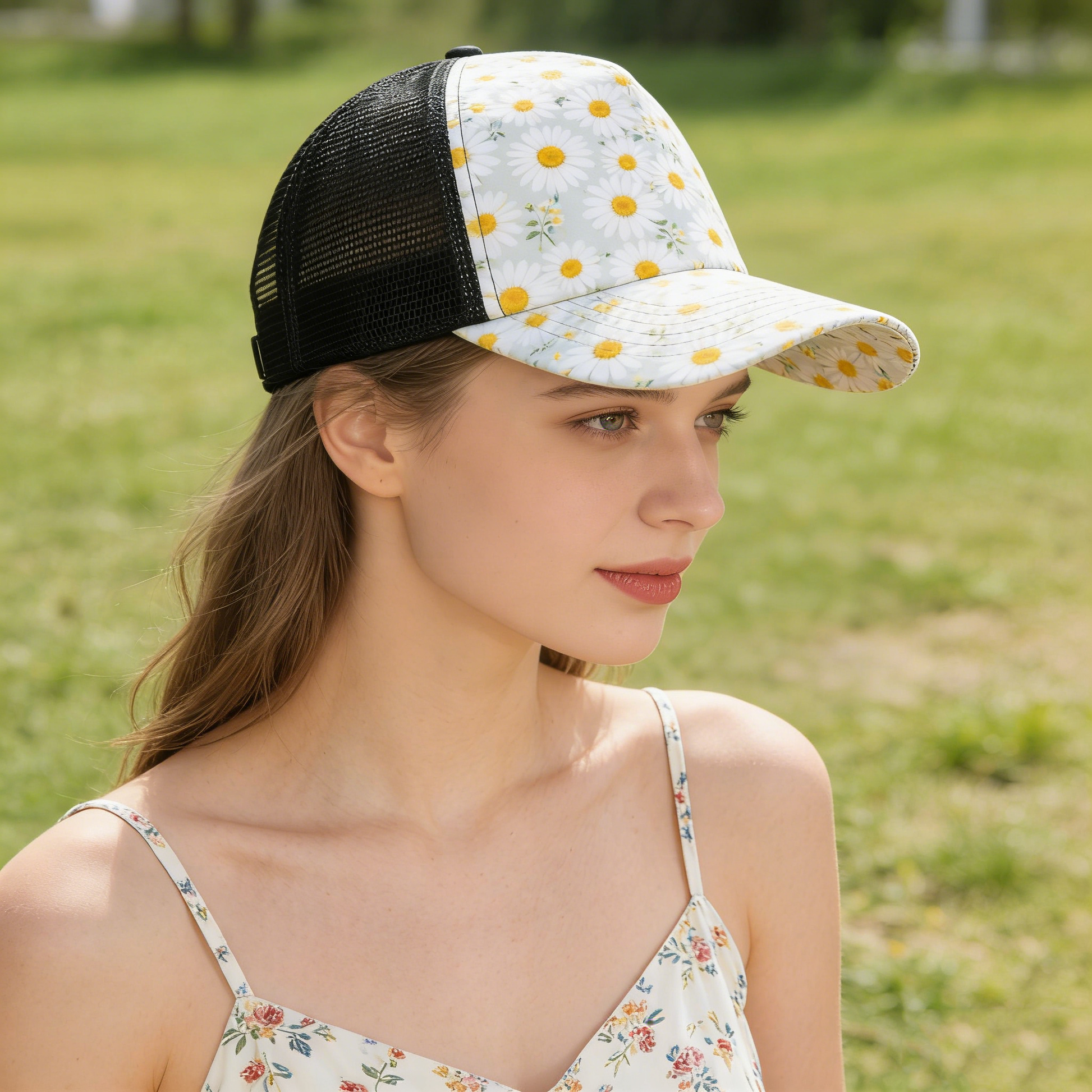 The Daisy Trucker Hat features a cheerful all-over daisy print on a soft off-white front, paired with a breathable black mesh back. Its laid-back, playful vibe makes it the perfect accessory for sunny days, music festivals, or casual weekend outings.